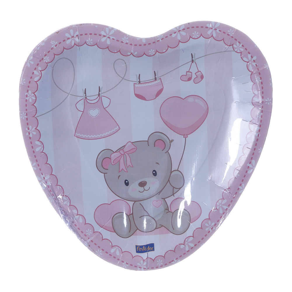 Prato de Papelão Descartável Coração Baby Ursinho Rosa Pacote com 8 Unidades Festcolor